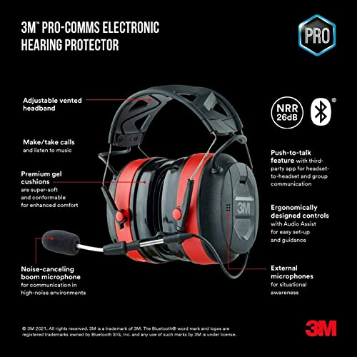 3M Pro-Comms Electronic Hearing Protector with Bluetooth Wireless Technology and External Microphones, Hearing protection, NRR 26 dB, Black/Red