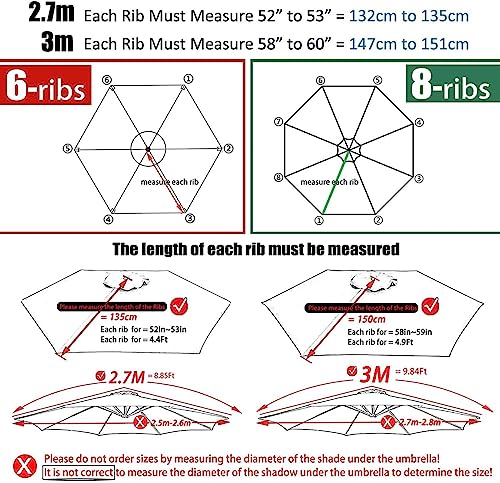 【Measurement Method】(Please refer to the picture): Please measure the length of each rib of the parasol before purchg, not the diameter of the Shadow under the umbrella, as shown in the picture: √ 1.35m or 1.5m. (4 Sizes Optional: 2.7m(6-ribs) , 3.0M(6-ribs) , 2.7m(8-ribs) , 3.0M(8-ribs))