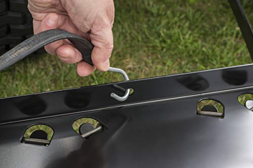 The de-thatcher features twenty 3/16-inch spring-loaded tines, heat-treated for greater durability in tougher conditions. Rustproof and replaceable, the tines are affixed to a heavy-duty steel tray. Users lower and lift the tines from use by pulling an upright lever on top of the tray. The long lever is easily accessible from the tractor seat. Two 7-inch diameter semi-pneumatic wheels with a width of 1-1/2 inches traverse most any terrain. A hitch pin accompanies the de-thatcher. For the best results, de-thatch in the spring, mid-summer, and fall to keep yards and fields healthy and attractive. The de-thatcher was manufactured in the USA and requires no tools for assembly. Upon shipping, the de-thatcher measures 40-1/2 by 11 by 4 inches and weighs 31 pounds.