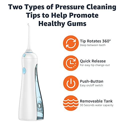 Specification: Amazon Basics HydroClean Cordless Water Flosser, 1 Handle, 2 Flosser Tips, 2 AA batteries included