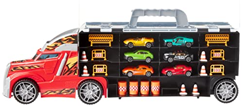 Truck Carry Case Car Carrier provides hours of fun with amazing features. Very detailed design with chrome wheels, modern looking cab head, awesome decal designs. Slide feature at the truck cab head provides fun filled sliding action. The front grill flips open and allows vehicles to easily slide out. Handle up top above the truck allows for easy carry away and also slots back into the body for easy storage. Multiple slots for easy storage of die cast cars, accessories, and other play pieces. Set includes 6 die-cast vehicles and 16 road accessories.