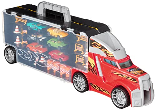 Specification: Amazon Basics Toy Car Carrier Truck With Storage For Kids Ages 3 and Up, 6-Pieces Diecast Vehicles & 16 Accessories, Multicolor, Medium