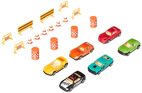 Set includes 6 die-cast vehicles and 16 road accessories