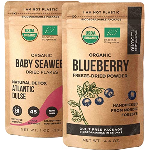 HIGHEST QUALITY 100% pure, vacuum dried Atlantic dulse seaweed and freeze-dried Wild Blueberry Powder. These drying techniques lock in nutrients and preserves without additives. This is a vegan, GMO-free and cruelty-free whole food you can enjoy with peace of mind. Simply delicious! CLEAN NORDIC ORIGIN Numami baby seaweed is responsibly cultivated in the North Atlantic. It purifies the ocean, produces oxygen and supports sea life. Baby seaweed is harvested after just FOUR MONTHS for freshness and to limit exposure to heavy metals and toxins, unlike other wild-harvested seaweeds. Our ORGANIC BLUEBERRY POWDER IS made from wild blueberries by carefully freeze-drying and slowly grinding to preserve all the natural wilderness. We are using the WHOLE BERRIES together with the skin and seeds so we do not lose any nutrients and this is the reason why our powder does not dissolve in the water. We believe in making HEALTHY EATING EASIER AND enjoyable and by helping you to do this in your own life we are creating healthier and happier families. Blueberry powder is full of vitamins, minerals and ANTIOXIDANTS TO protect your cells from oxidative stress. Wild Nordic Blueberries have 4 times higher concentrations of antioxidants as compared to farmed blueberries. Protecting the environment is our passion, so all our products are packed in BIODEGRADABLE PACKAGES FOR minimum impact to our planet. From now on you can enjoy healthy food guilt-free because our packages are not made from plastic. Our packaging materials are 3rd party tested and certified to biodegrade in less than 3 months. There is already too much plastic in the world and you know it.