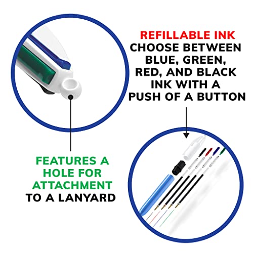 Keep your notes and data organized with BIC 4-Color Ballpoint Pens so you always have the perfect color ink. The versatile 1.0mm medium point creates clear, dark lines for tidy notes and helps you handle a variety of writing activities. Long-lasting ink gives these multicolor pens the endurance you can depend on for your projects. The wide barrel design is easy to grip, ensuring comfortable handling during writing sessions. With the lanyard hole and built-in clip, you can attach these to notebooks or wear them around your neck to keep these colorful pens within easy reach at all times. With a simple click, you can easily advance the desired color for these retractable ballpoint pens and unleash your creativity. They’re also a great choice if you need writing pens for journaling, doodling or organizing. As cost-effective refillable pens, each multicolor ballpoint pen can use ink refills for pens to lengthen the life of your pen and help reduce waste*. Black, blue, red and green inks in these colored ballpoint pens make them ideal pens for teachers. Enhance your productivity with BIC 4-Color Ballpoint Pens. *Color ballpoint pen refills sold separately, with all four ink colors in one pack.