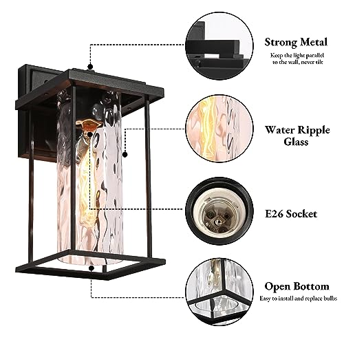 Black Outdoor Wall Lights, Farmhouse Exterior Wall Sconces Light Fixture with Cylindrical Water Ripple Glass Shade, Modern Waterproof Lanterns for Front Door, Entry, Porch, Patio, and Gazebo
