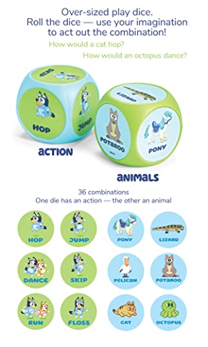 INCLUDES: 1 action die featuring Bluey and Bingo poses and 1 animal die featuring fun animals from the show.