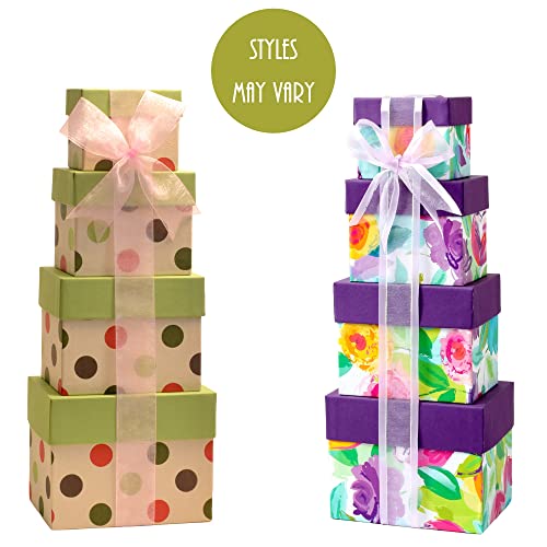REUSABLE CONTAINER: This gift tower measures 5″ x 7″ x 17″ and includes 4 coordinating, stacked boxes. Reuse for decoration or storage for photos, mementos, and household items. Each gift includes a gift tag for a personalized touch.