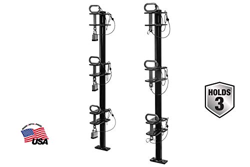 Buyers Products Lockable Trimmer Racks mount to any open style landscape trailer and hold up to three trimmers. They keep your trimmers secure and your trailer organized. The channel and flat pin design is adjustable to provide a tight hold on your trimmers and reduce rattle while in motion. They included padlocks to secure the pins in place and help deter theft. The rack features sturdy steel construction with a corrosion resistant black powder-coated finish. Mounting hardware is included.