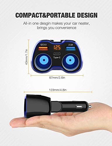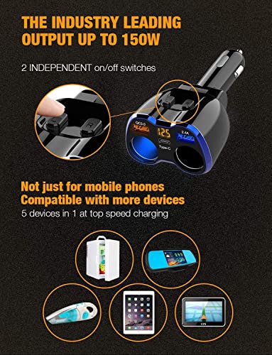 Specification: Car Charger, 150W 2-Socket Cigarette Lighter Splitter QC 3.0 Dual USB Ports 1 USB C Fast Car Adapter with Separate Switch LED Voltmeter Replaceable 15A Fuse for GPS/Dash Cam/Phone/iPad