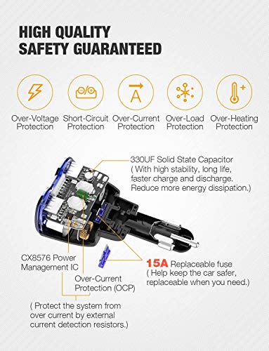 【Multi Protection & LED Voltmeter】The Multi-Protect Safety System with built-in replaceable 15A fuse and smart recognition chip, cuts off the current to prevent your devices from overheating, over-current, over-voltage, and short-circuit protection. It includes a LED display for automatically monitoring your car battery once the vehicle power center is on. You get peace of mind knowing your battery life is protected.