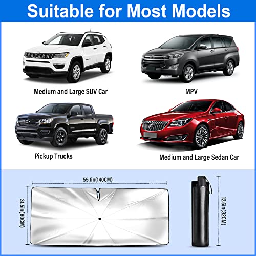 Car Windshield Sun Shade Umbrella, Foldable Front Window Sunshade Umbrella for UV Ray Block & Heat Protection, Automotive Sunshades Fit Most Vehicles Accessories (55”X31.5”)