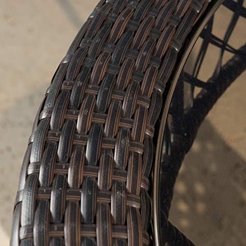Includes: one table color: Brown wicker round dining table with amber glass top multi-brown PE wicker to handle all-weather conditions No assembly required Dimensions: 34″L x 34″W x 28″H.