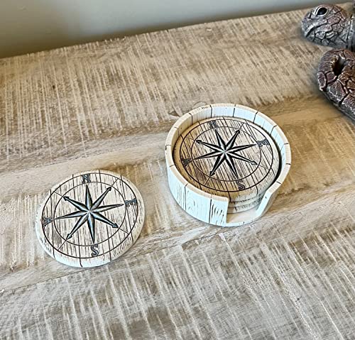 Compass Rose Coaster Set – Nautical Ocean Beach Boat Coastal Decor – Rustic Weathered White Finish