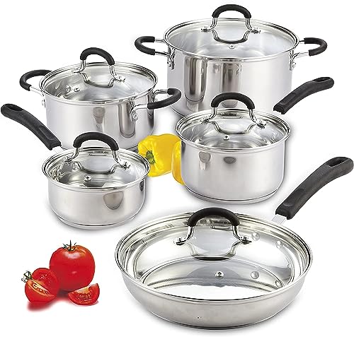 Cook N Home Stainless Steel Cookware Sets 10-Piece, Pots and Pans Kitchen Cooking Set with Stay-Cool Handles, Dishwasher Safe, Silver