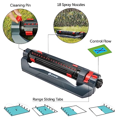 The Eden 4,000 Sq. Ft. Turbo Oscillating Sprinkler is perfect for watering medium to large-sized areas with a gentle flow of water. Featuring adjustable controls for the width, range, and flow, you can water everything from a wide-ranging lawn to a narrow garden. The easy-to-use controls deliver precise watering and superior coverage up to 4,000 sq. ft. (371 m²), tested at 40 P.S.I (Dynamic) in a wind free environment. When in use, the large volume center tube fills with water to stabilize water flow and maximize coverage. Our patented, sealed turbo drive ensures smooth operation regardless of water pressure for reliable performance. The 4,000 Sq. Ft. Turbo Oscillating Sprinkler has a built-in tool to keep the nozzles clean and ensure years of reliable operation. The included Quick Connect Starter Set allows you to easily disconnect/reconnect the sprinkler or other watering tools. The lock feature secures the sprinkler in place, preventing any accidental detachment. Use the additional Product Adapter for your nozzles, wands, or other watering tools to switch between tools, even with the water running.