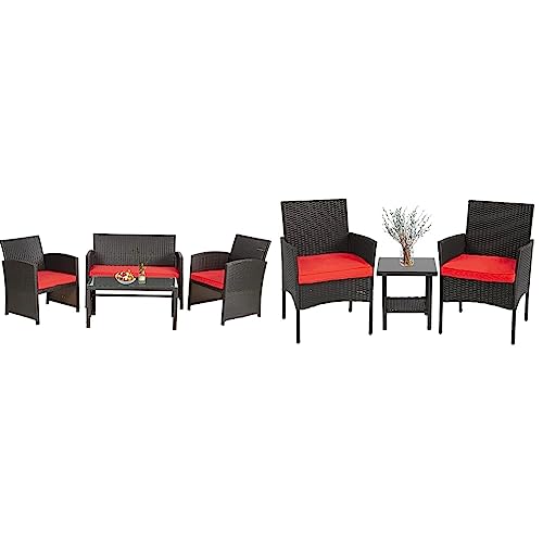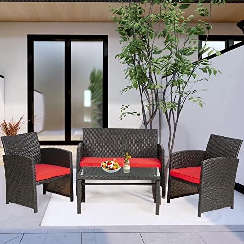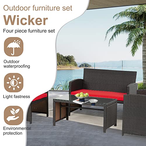 FDW Outdoor Furniture 4 Pieces Patio Furniture Set Wicker Conversation Set Rattan Chair Patio Set for Poolside Lawn Porch Balcony Garden (Brown and Red)