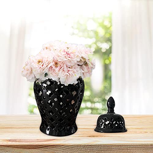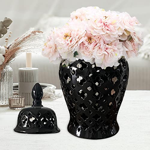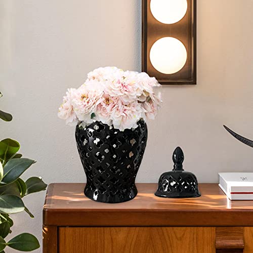 Ginger Jar Porcelain Ginger Jar Lattice 14″ Modern Pierced Temple Jar Vase Ceramic Vases for Flowers for Home Office Decor Gift Centerpiece, Black
