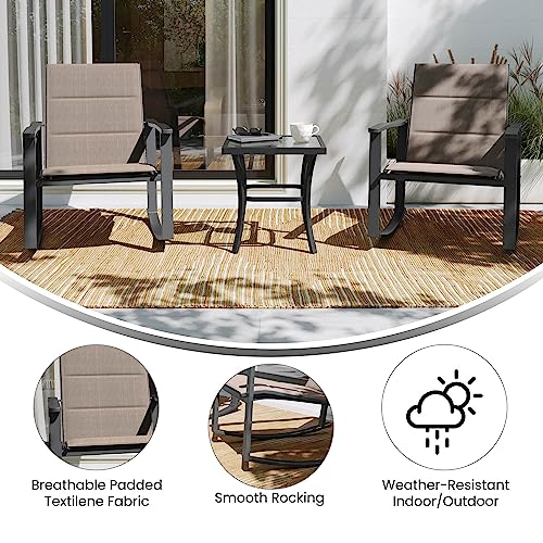 Flash Furniture FV-FSC-2315-BRN-GG Brazos 3 Piece Outdoor Rocking Chair Bistro Set with Flex Comfort Material and Metal Framed Glass Top Table, Brown/Black