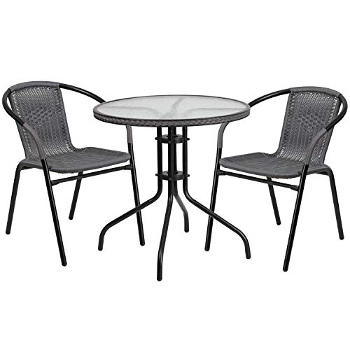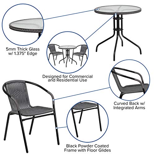 Specification: Flash Furniture 3-Piece Patio Dining Set with Round Glass Metal Table and 2 Stackable Rattan Chairs, Indoor/Outdoor Bistro Table and Chairs Set, Gray