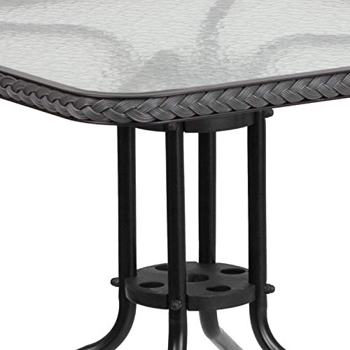 Specification: Flash Furniture Lila 28” Square Glass Metal Table with Gray Rattan Edging and 4 Gray Rattan Stack Chairs