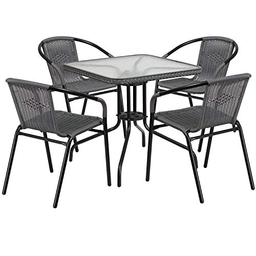 Flash Furniture Lila 28” Square Glass Metal Table with Gray Rattan Edging and 4 Gray Rattan Stack Chairs