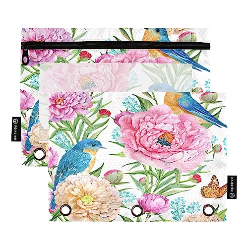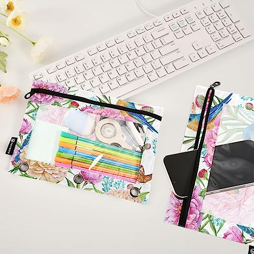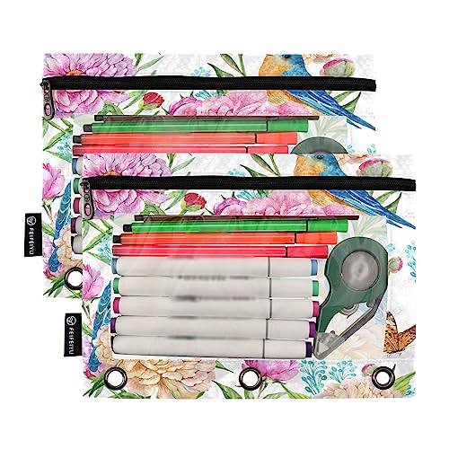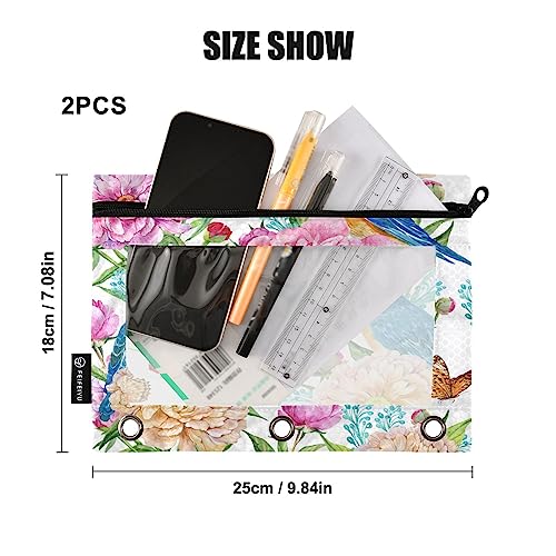 Flowers Birds Binder Pencil Pouch for 3 Ring Pencil Pouch with Zipper Clear Window Pencil Case Pencil Pouches Bags for Travel Office Supplies, 2 Pack