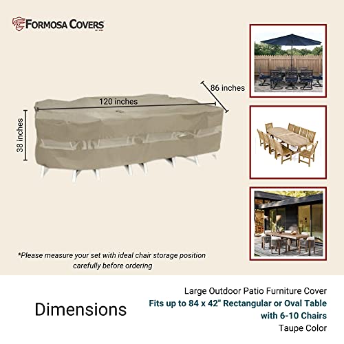Formosa Covers | Extra Large Outdoor Patio Dining Set Cover 120″ L x 86″ W fits Oval and Rectangular Dining Furniture Set with 6-10 Chairs and Swivel Rockers, Center Hole for Umbrella – Taupe