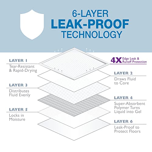America’s Original Trusted Pads are more advanced than ever! Four Paws Wee-Wee Pads with Insta-Rise Border are a first-of-their-kind waste management solution. These dog training pads feature a patent-pending, 4-sided wetness-activated border that rises when exposed to liquids. The result? Four times the edge leak and runoff protection! Complete with the high-performance Floor Armor Leak-Proof System and maximum absorption technology. Providing even more peace of mind, dual action wet-lock gel absorbs fluids and odors while over-sized rapid dry quilt pockets increase fluid absorption capacity. Plus, these 6-layer housetraining pads include targeted attractant to draw your dog to the pad. Made for any dog of any size, these large Wee-Wee Pads are perfect for puppy potty training and beyond!
