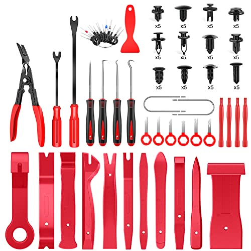 Package Include:Including 60PCS Car Retainer Clips, 11PCS Trim Removal Tools, 1PC Trim Clip Removal Pliers, 1PC Car Foil Small Scraper Tool, 2PCS upholstery fastener remover, 4PCS precision hook pick, 4PCS Round Handle Crowbar, 8PCS stainless steel stereo removal tools,11PCS stainless steel Auto Terminal Removal Tool and a portable bag