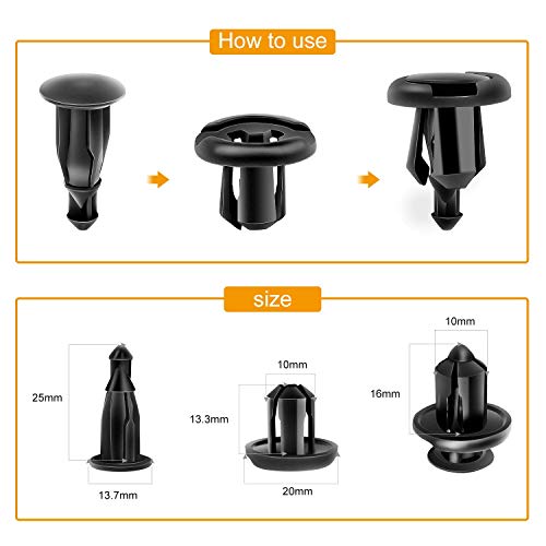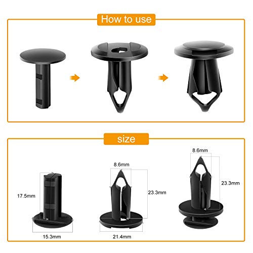 Specification: Material: Black Nylon, suitable for car use Better replacement for original old worn broken one. Push type, easy to fasten. Application: 8mm Push type Clips It fits on most of auto parts with 8mm hole.Commonly used for side skirt, bumper, car fender, engine cover, door trim panel, interior trim panel and various trim panels 10mm Push type Clips Not only the car model below, if the shape and size meet your needs, it will fit well. Fit: HONDA 1997-2011 Accord 1997-2010 Civic 1999-2010 CR-V 1984 1991 CRX 1993-1997 Del Sol 2003-2010 Element 2007-2010 Fit 2000-2006 Insight 1996-2010 Odyssey 2003-2010 Pilot 2007-2001 Prelude 2006-2010 Ridgeline 2000-2008 S2000 Acura 2001-2003 CL 1996-2001 Integra 2001-2010 MDX 2007-2010 RDX 1996-2010 RL 2002-2006 RSX 1997-2010 TL 2004-2010 TSX Attention: Not for Mazda b2200, 2014 Subaru BRZ Package Includes: 100 x 8mm Push type Clips 50 x 10mm Bumper Clips 1 x Fastener Removal Tool.
