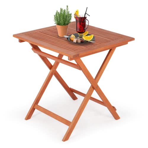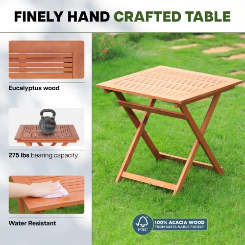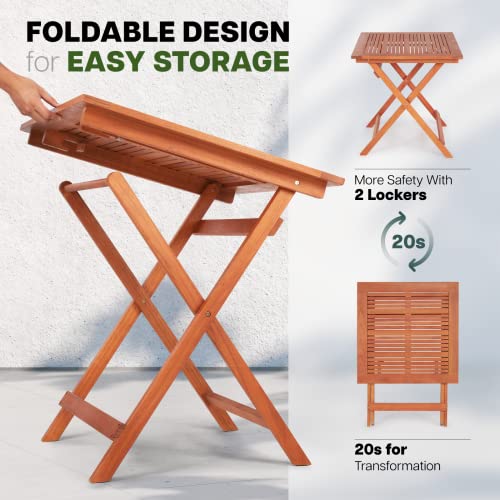 PREMIUM EUCALYPTUS WOOD: Our folding side table outdoor is expertly crafted from FSC-certified eucalyptus wood, coated with high-grade oil paint that protects the surface from UV rays & provides weather resistance