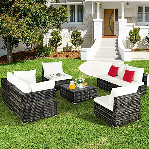 Featuring 1 large coffee table, 2 corner sofas and 4 single sofas, the position and combination of this outdoor conversation set can be adjusted freely based on your various demands. Therefore, you can choose an appropriate combination to make outdoor life more comfortable. With soft cushions and pillows, this wicker sectional sofa set makes you feel cozy while sitting. Moreover, this 7 pcs sectional rattan sofa set is made of all-weather PE rattan and supported by heavy duty steel frame with rustproof surface so that it is perfect for outdoors. And the anti-rust aluminum feet prevent direct contact between furniture and ground for a long time use. Additionally, the coffee table with tempered glass allows you to put different items with ease. And the removable covers can be washed for daily maintenance.