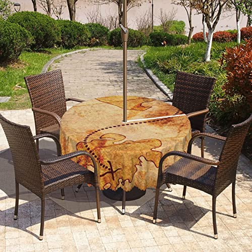 Lirduipu Compass Pattern Round Outdoor Tablecloth,Patio Table Covers,Round Table Cloth Washable Water Resistance Tablecloth with Umbrella Hole Zippered,for Patio Garden Tabletop Decor(72″ Round,Tan)