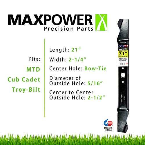 MaxPower’s 331538B includes 1 high lift blade for many 21-in cut MTD, Cub Cadet and Troy-Bilt walk behind mowers. This blade replaces OEM number 942-0642 and measures 21-in L and 2-1/4-in W with a bow-tie center hole pattern. To ensure proper fit, please verify the OEM number of the blade you are replacing matches the OEM number listed in this description. MaxPower blades are proudly manufactured in the USA to meet or exceed OEM specification.