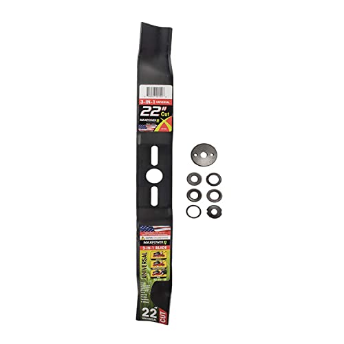 MaxPower’s 331952B includes (1) 22 in. universal 3-in-1 mower blade. This blade measures 22 in. L and 2-1/4 in. W with a 1 in. center hole. It includes a cover washer and 6 reducing washers in the following sizes: 3/8 in., 7/16 in., 9/16 in., 1/2 in., 5/8 in. and 3/16 in. This blade is designed to fit MOST 22” cut mowers. Recommended for gas powered mowers – not to be used with battery powered or electric mowers. MaxPower blades are proudly manufactured to meet or exceed OEM specifications.