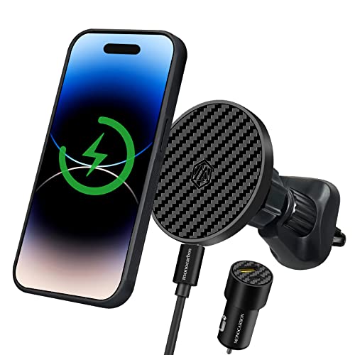 MONOCARBON Magnetic Car Phone Holder with Charger for iPhone 14 Pro Max, 13 Pro, 12, 11, XS, X, 8, 7, 6, SE, iPad, Air, Mini, Apple Watch – Twill Carbon Matte Black