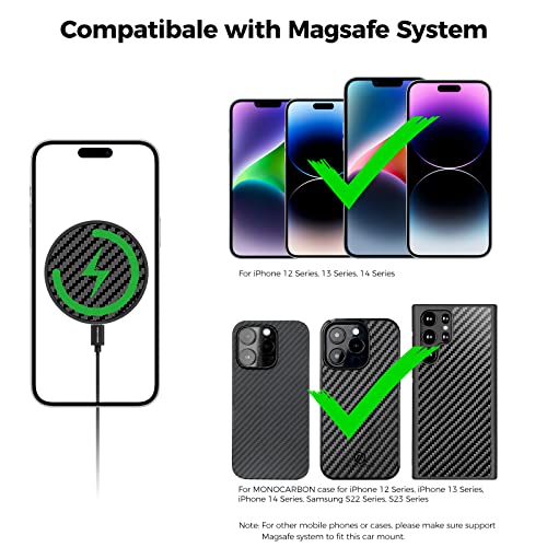 [Compatible with Magnetic Phone Case]-MONOCARBON magnetic car mount exclusively compatible with iPhone series and each magsafe phone protect case. The built-in magnet array forms a closed magnetic field. The magnetic force is enhanced without influencing the signal of the phone, ensuring that your navigation signal and call quality will not be disturbed.