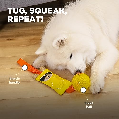 DOG TUG TOY with durable tug handle on one end and a squeaking spike ball on the other