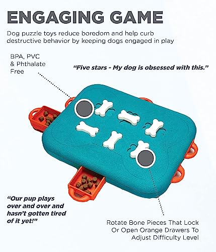 SWIVEL, PULL, & LOCK TO HIDE TREATS: Simply pull out the orange drawers, fill with treats,and push back in. Swivel the dog bone to lock the drawers for an added challenge or leave them in place get new dogs accustomed to the game.