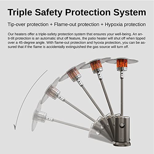 ๐๐ฑ๐๐ฎ๐ป๐ฐ๐ฒ๐ฑ ๐ง๐ถ๐ฝ-๐ผ๐๐ฒ๐ฟ ๐ฎ๐ป๐ฑ ๐๐น๐ฎ๐บ๐ฒ-๐ผ๐๐ ๐ฆ๐ฎ๐ณ๐ฒ๐๐ ๐ฃ๐ฟ๐ผ๐๐ฒ๐ฐ๐๐ถ๐ผ๐ป ๐ฆ๐๐๐๐ฒ๐บ – Our heater is equipped with three anchoring arms, which are recommended to be rooted down into the ground to prevent the heater from being blown over. What’s more, our propane patio heaters offer a triple-safety protection system that ensures your well-being. With tilt safety auto-shutoff valve protection, if the flame is accidentally extinguished, the gas source will turn off. This all adds up to protection against anoxia and dumping.