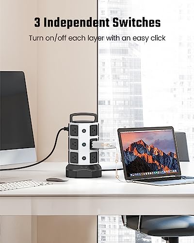 Power Strip Tower Surge Protector, JACKYLED 1625W 13A Outlet Surge Electric Tower, 12 Outlets 6 USB Ports Retractable Cord Charging Station with 16AWG 6.5ft Heavy Duty Extension Cord for Home Office