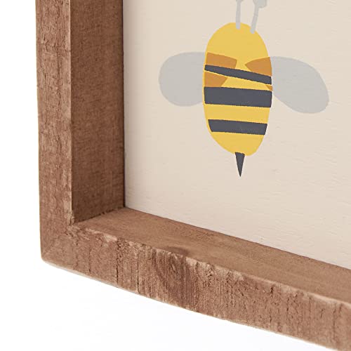 A wooden inset home décor sign displaying block print art of bees with “Bee Kind” sentiment on cream color background. home décor sign features natural stain wood and inset design. Easy to hang or can free-stand alone.