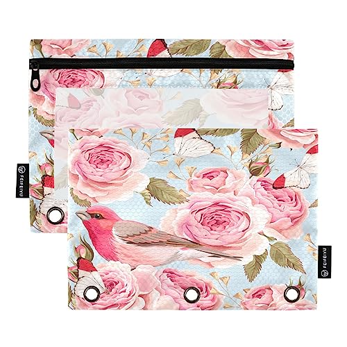 Rose Birds Flowers Binder Pencil Pouch for 3 Ring Pencil Pouch with Zipper Clear Window Pencil Case Pencil Pouches Bags for Office Supplies Daily, 2 Pack