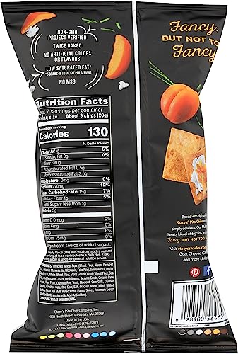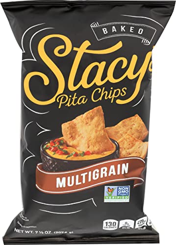 Stacy’s multigrain pita chips are low in saturated fat with only 0.5 gram per serving for a health-conscious snack. We don’t use any artificial colors, flavors, GMO ingredients or msg to keep the taste pure. Plus, each 7.33 ounce bag contains a blend of 6 grains for added nutrition. See nutrition facts panel for allergens.