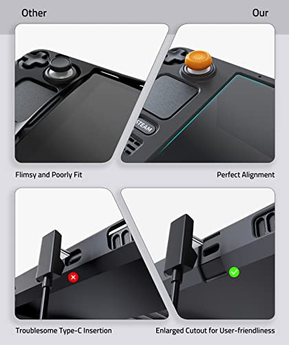 Enhanced Alignment & Fit: This protective cover is specially designed for Steam Deck. To improve the looseness and sag issues along the edges of the screen, we adopt a zero-clearance design and upgrade the silicone reformation process to maximally ensure the case’s precise alignment and visual appeal.