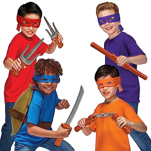 ACCESSORIES: Set includes everything you and your friends need to role play being your favorite Ninja Turtle, including all four colorful Turtle bandanas and one Ninja Turtle back shell!