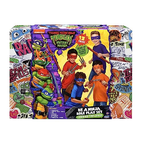 It’s time to suit up! When New York City descends into mayhem, this mutant team needs some new allies. Join the fight against evil with all the essential equipment: masks in each Turtle’s signature color, a collection of classic weapons, and your very own Turtle shell. Dress up in iconic Ninja Turtle gear and take down New York’s villains—just like in the new CG animated Mutant Mayhem movie! Set includes everything you and your friends need to role play being your favorite Ninja Turtle!