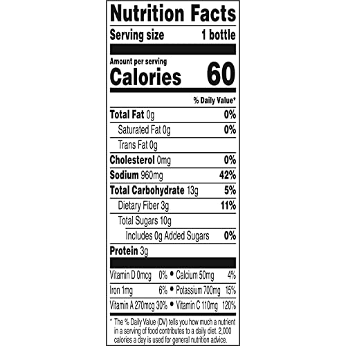 Excellent Source of Vitamins: This veggie juice is an excellent source of vitamin A and vitamin C, and contains 60 calories and 3 full servings of vegetables per 12 fl oz serving