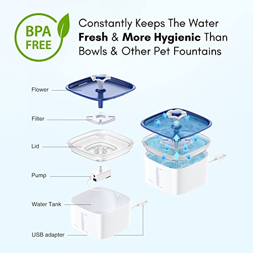 Large capacity: Staying hydrated is the key to preventing kidney and urinary tract diseases. The 95oz capacity makes this pet fountain water dispenser a perfect fit for small to medium dog breeds and all cats.